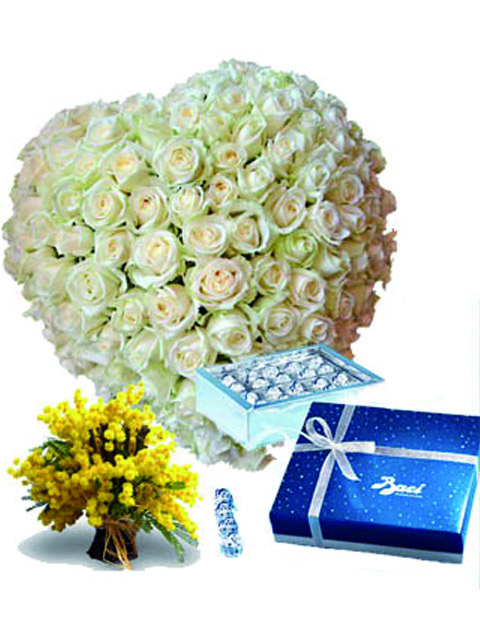 Cuore di 100 rose bianche )solo boccioli accostati) abbinato ad un fascio di mimosa e a una scatola di baci perugina.
