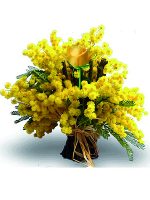 Mazzo mimosa con una rosa gialla al centro.